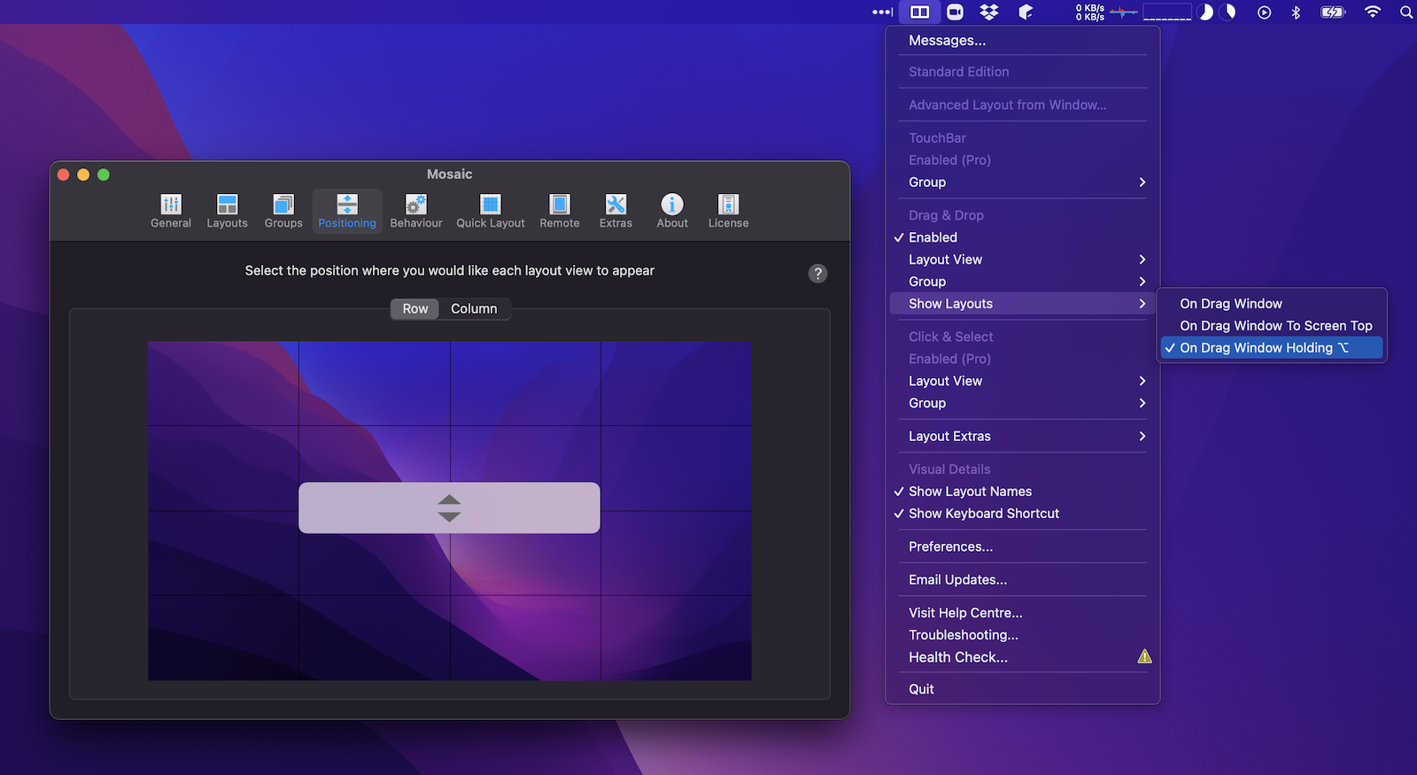 You can change the event that triggers "Show Layouts" (from the context menu in the OS menu bar) and set it to "On Drag Window holding OPTION". See screenshot below.